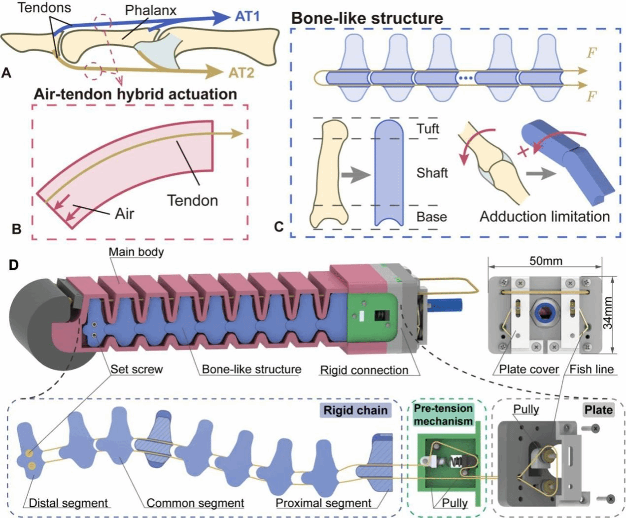 利用软体材料的柔顺性适应不规则或易碎物体的表面,简化了软体机械手抓取过程复杂的控制,具有广阔应用前景,然而软体机械手低刚度的特性限制了其抓取的负载能力和稳定性。针对这一问题,本研究通过学习人体手指的解剖学特征,提出一种双向可变刚度软体驱动器(BISA)(图1)。人在抓取过程中,可以通过肌肉的拮抗作用提升关节刚度;同时,指骨相互啮合的形状以及覆盖的结缔组织能够保证侧向的稳定性。基于上述两点解剖学特性,驱动器具有两种刚度调节机构,包括用于调节弯曲刚度的气动-肌腱混合驱动(ATA)和用于调节侧向刚度的类骨结构(BLS)。气动-肌腱混合驱动为驱动器的主要驱动弯曲的方式,同时能够通过拮抗作用调节弯曲刚度。承受侧向载荷的类骨结构如同人类手指中的指骨,在绳子的驱动下能进行弯曲。多节类骨结构通过绳子紧密连接,并包裹在气动-肌腱混合驱动器内,承受侧面载荷。在侧向刚度调制过程中,类骨结构不会对弯曲方向产生过大影响。