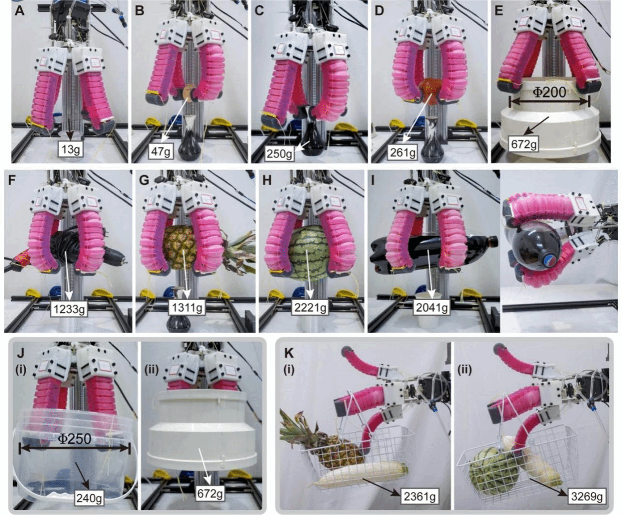 实验表明,当弯曲角度为 45° 时,刚度调节范围约为三倍,最大刚度约为 0.7 N/mm。类骨结构则在不影响弯曲柔顺性的情况下,通过改变对结构的拉力进而改变侧向刚度。与不安装类骨机构的驱动器相比,侧向刚度有效提高3.9倍。同时类骨机构可以在不影响弯曲刚度的前提下,在一定范围内解耦调节侧向刚度。测试结果表明,刚性的类骨机构对弯曲柔顺性的影响很小。基于该驱动器具有的优秀性质,进一步提出了一种多功能通用软体机械手,能够实现跨尺度、跨重量和多模态的抓取任务(图2)。