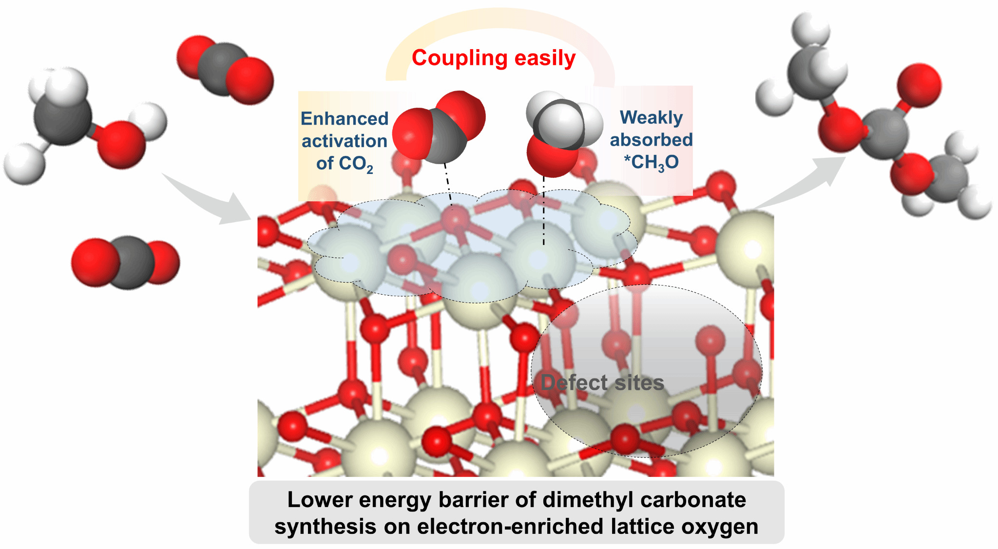 以CO2为原料直接合成碳酸二甲酯(DMC)在碳中和方面具有重要的理论和实践价值,但由于缺乏对反应机制的深入认识和高效催化剂的设计策略,其效率远未达到应用要求。反应中,由于两种反应物吸附活化行为差异的矛盾,关键反应中间体(*CH3OCOO)难以形成和转化是该反应面临的关键问题。氧化铈(CeO2)是CO2与甲醇直接合成DMC的常用催化剂。尽管传统富含氧空位的催化剂具有良好的CO2的吸附活化能力,但远不能满足反应中在活化CO2同时形成活性甲氧基的关键需求。因此,设计一种既可活化CO2又能诱导形成活性甲氧基的新活性位点有望实现反应物的快速偶联并获得高收率碳酸二甲酯。