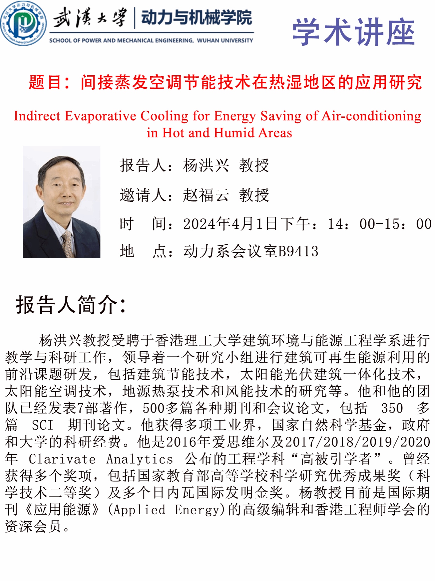 学术报告:间接蒸发空调节能技术在热湿地区的应用研究