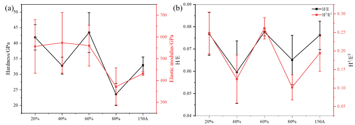 图2 (a)高熵涂层的硬度、弹性模量和(b)涂层的H/E和H3 /E2比值随脉冲电源占空比的变化