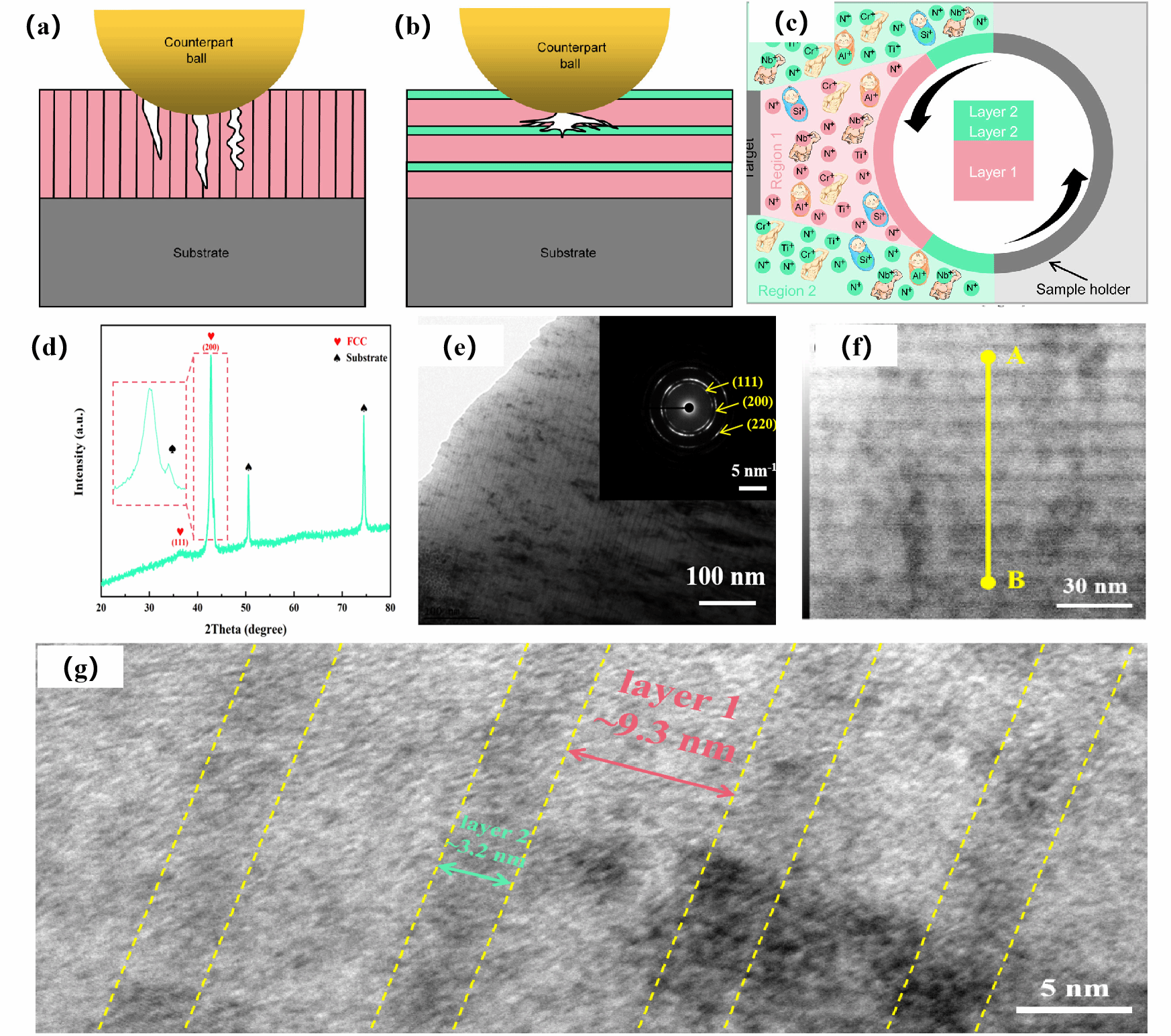 AlCrNbSiTiN高熵硬质涂层是刀具和模具领域硬质涂层的研究前沿。为了获得高硬度高韧性涂层,传统方法是采用两种不同的材料交替沉积获取纳米多层涂层,达到增硬和增韧效果(图1a-b)。但制备过程复杂,稳定性差。本论文采用一种创新的成分渐变控制方法,在单一材料中首次实现了多层结构的自组装制备。如图1c所示,其主要利用电弧蒸发源表面等离子体分布不均匀特性,实现在靶中和靶边缘不同区域沉积不同成分的高熵涂层,工件持续旋转形成多层纳米结构(图1e)。在涂层的透射电镜横截面图像中可以看到明显的纳米多层结构(图1e)。涂层的高分辨率透射电镜(HRTEM)图像清楚地显示(Cr, Nb)富集层(layer 2)的厚度约为3.2 nm,正常层(layer 1)的厚度约为9.3 nm,涂层的调制周期约为12.5 nm(图1g)。AlCrNbSiTiN涂层中大量的纳米界面阻断了柱状晶体的生长,降低了裂纹沿晶界穿透涂层的倾向。自组装多层结构的构建改变了涂层的开裂机制,显著提高了高熵涂层的耐磨性,获得了较好的应用效果,为高硬强韧硬质涂层的开发提供了新的思路。