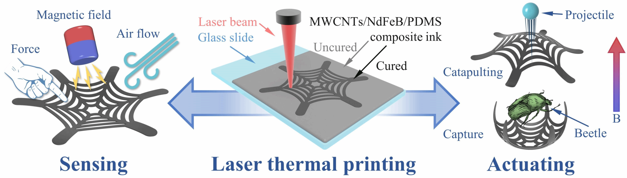 为了解决上述问题,刘锋课题组基于激光光热效应和聚二甲基硅氧烷(PDMS)的热固化特性,首次提出了一种新型激光热打印工艺。制备的智能蜘蛛网在PDMS基体中集成了多壁碳纳米管(MWCNTs)导电网络和钕铁硼(NdFeB)磁性颗粒,实现了多功能传感、刺激响应和驱动功能的无缝结合。该智能蜘蛛网具有多种传感特性,应变系数和磁场灵敏度分别为2.37和0.312 %·mT−1,具有超过3500次循环的优秀稳定性。此外,智能蜘蛛网能够实时感知猎物并对其进行准确捕获,验证了其快速刺激响应特性。同时,智能蜘蛛网的电磁弹射功能可实现超过弹丸尺寸33.5倍的弹射高度,展示出其强大的驱动能力。因此,基于创新的激光热打印工艺,智能蜘蛛网成功地集成了多功能传感、刺激响应和驱动功能,这也标志着基于热固性材料的小型化、多功能柔性智能器件的高效制备取得了重大进展。