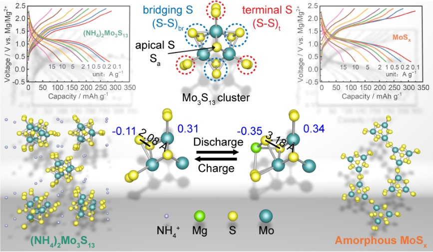 设计合成了电荷离域的Mo3S13团簇材料作为镁电池正极,利用类共价Mo‒S键促进负电荷离域和双元素氧化还原,实现了高储镁容量和优异的倍率性能。作为镁离子的缔合位点,Mo3S13团簇的桥联硫(S‒S)br的价态在充放电过程中可逆变化且S‒S键断键/成键,使得镁离子的缔合/解缔高度可逆。该工作发表在ACS Nano上(ACS Nano, 2024, 18, 5590‒5598)。