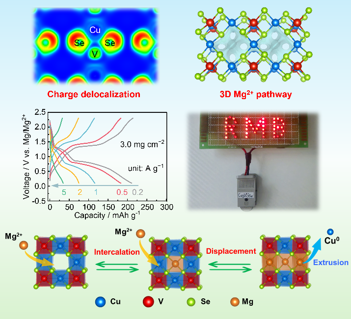 设计合成了半导体Cu3VSe4镁电池正极,通过类共价V‒Se键促进负电荷离域,通过镁离子嵌入和置换反应机制,实现了Cu、V和Se元素的共氧化还原和较高的储镁反应可逆性。Cu3VSe4具有高容量、高倍率,且在高负载量下仍能实现高倍率性能。上述研究所揭示的储镁性质与电子结构的相互关系,为设计高性能镁电池正极材料提供了合理的设计原则。该工作近日发表在Advanced Functional Materials上(Advanced Functional Materials, 2024, 2411223)。