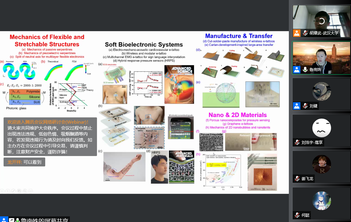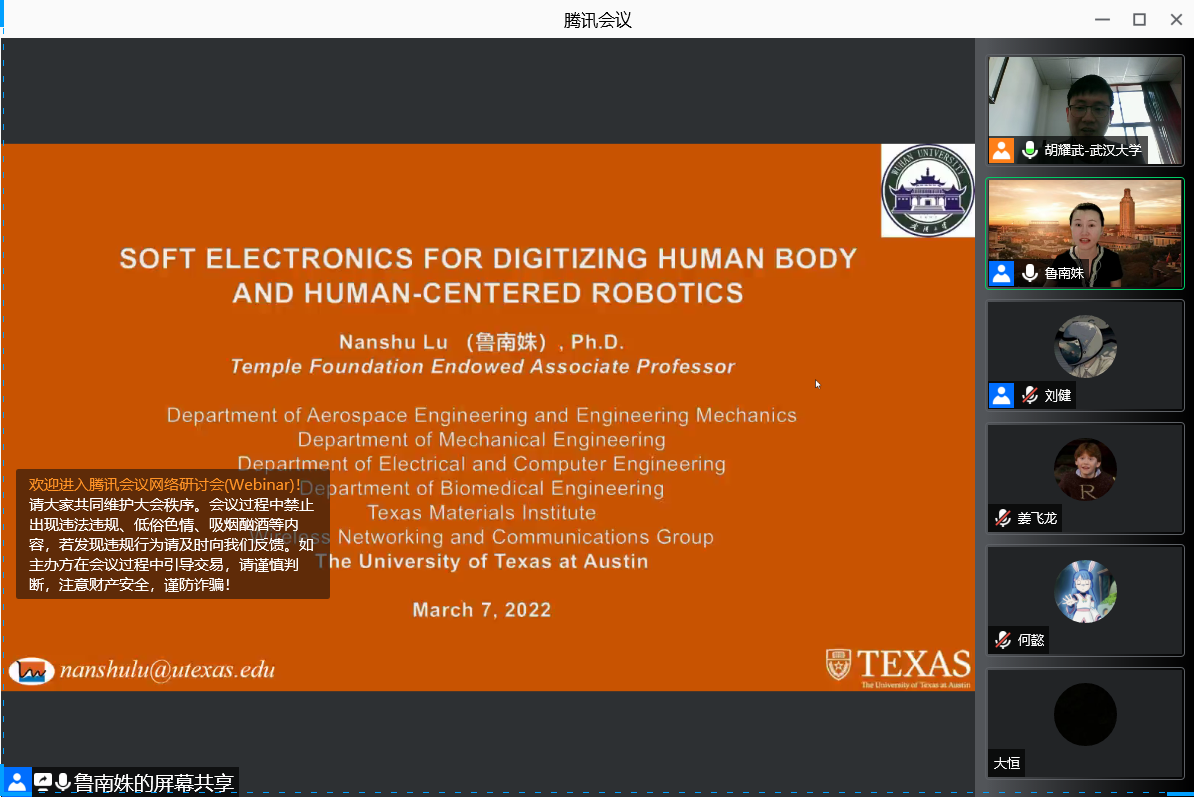 本网讯(通讯员:尚瑨 编辑:陈飏 审核:胡耀武、刘泽庭)3月7日中午,美国德州大学奥斯汀分校力学/机械等院系教授鲁南姝在巴卡漫画 通过线上会议的形式,举行“用于人体数字化和智能仿生机器人的生物电子元件”学术研讨会,学院副院长胡耀武及部分师生参加了本次研讨会,本次研讨会由胡耀武主持。