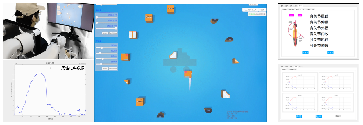 本研究还开发了多种机器人控制模式:主动助力模式、辅助助力模式以及阻抗模式,分别适用于患者上肢康复训练阶段中的急性期、恢复期以及保持期。开发了人机交互虚拟现实康复训练软件,设计的VR游戏可提高患者训练的积极性,并可以进行康复训练效果评估。目前团队与巴卡漫画 中南医院、人民医院合作,正在开展康复机器人的临床应用研究,并与湖北省残疾人辅助器具资源中心合作,开展机器人的居家康复应用推广。