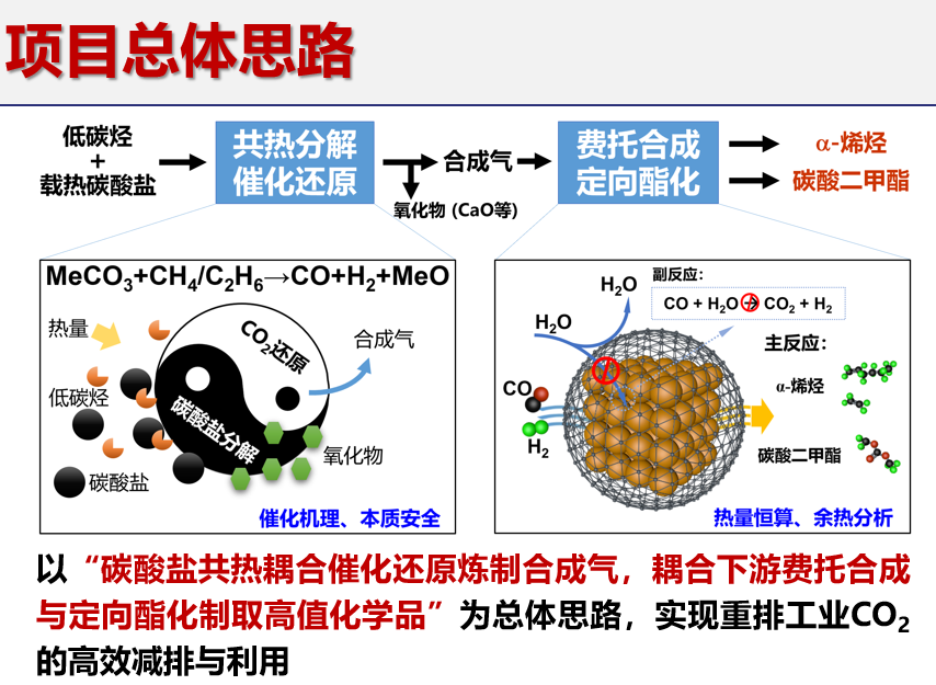 本项目聚焦水泥、钢铁、耐材等重排放工业CO2捕集利用与封存技术存在流程复杂、能耗大、效率低、成本高等难题,以共热前提下碳酸盐分解耦合炼制过程的还原反应机制、热量恒算及余热分析为研究对象,确立了“提高供氢分子定向转化效率、降低反应温度、提升本质安全性”等重要目标,并在此基础上耦合合成气的费托合成、酯化反应等,力图构建碳酸盐共热耦合催化还原炼制新技术示范平台,为重排放工业的减碳增效开辟新方向。