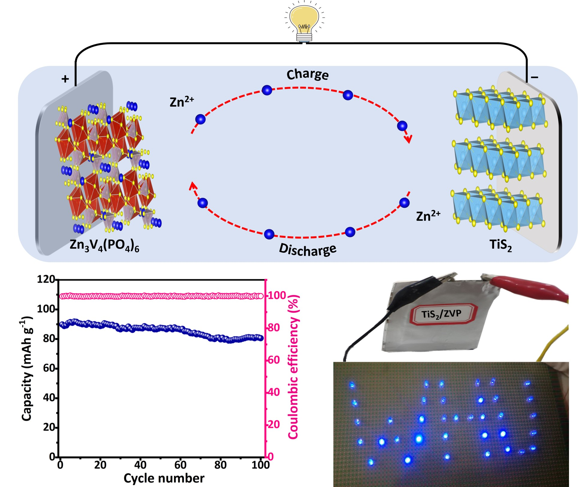 水系锌离子电池具有安全性高、原料丰富、成本低廉、绿色环保等诸多优点,是大规模储能电池的理想选择之一。然而目前锌金属负极存在枝晶、腐蚀、钝化和利用率低等问题。尽管目前有很多针对锌金属和电解液的改性策略,但是都没有从根本上解决上述问题。开发含锌正极与非锌负极相匹配的“摇椅式”电池是应对上述挑战的一种有效策略,然而,这种能够提供可逆和稳定的Zn2+存储的含锌结构却很少报道。赵栋等通过喷雾干燥法制取了Zn3V4(PO4)6 ,并首次揭示了其储锌机理,该正极可提供105.2 mAh g-1的可逆容量和优异的循环性能。与层状TiS2负极匹配构建了“摇椅式”水系锌离子电池,100周循环后容量保持率为94.3%,该工作可为大规模储能用水系锌离子电池的设计提供新思路。