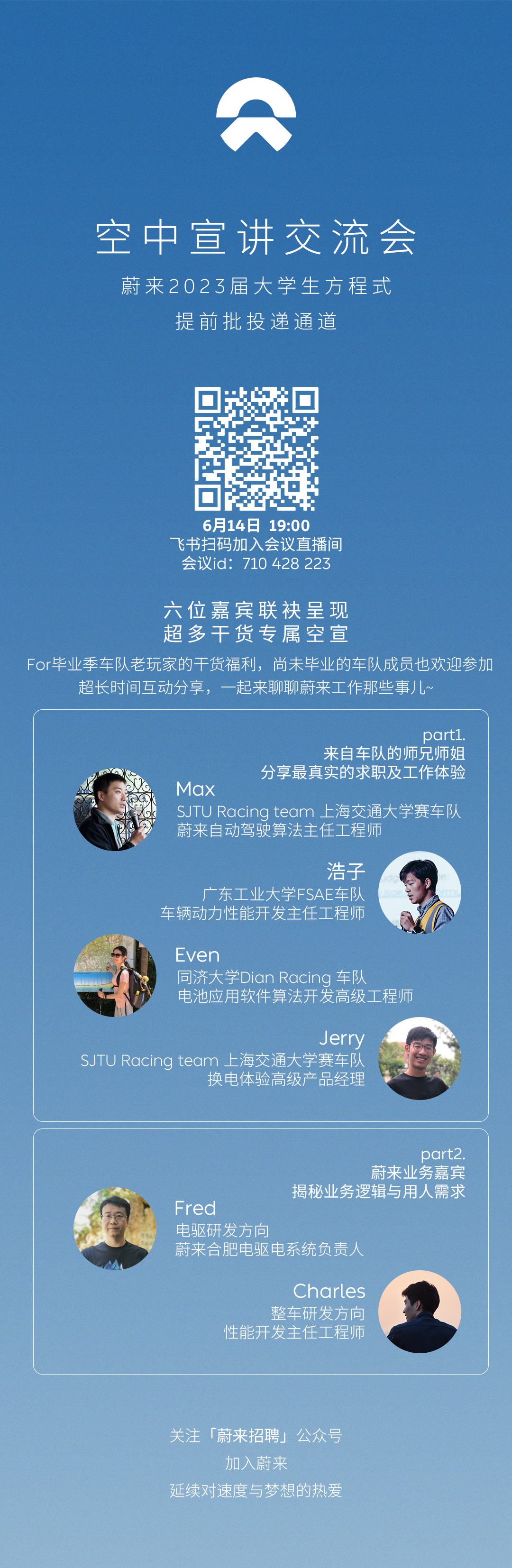 (22年6月14日晚19:00)空中宣讲交流会 蔚来2023届大学生方程式提前批投递通道