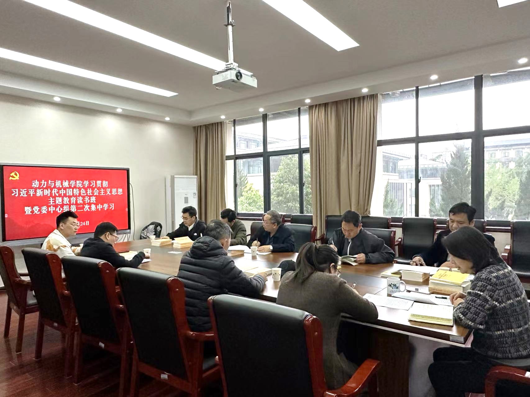 (供稿:刘海、黄佳倩子,图片:段宁)为深入开展学习贯彻习近平新时代中国特色社会主义思想主题教育,根据党中央部署和学院主题教育工作安排,4月24日,学院主题教育读书班开班,并围绕加强党的政治建设和思想建设,坚定捍卫“两个确立”,坚决做到“两个维护”相关篇目,进行第一次集中学习暨党委理论学习中心组第二次集中学习。学院主题教育领导小组成员、党委委员、主题教育工作组成员参加会议。