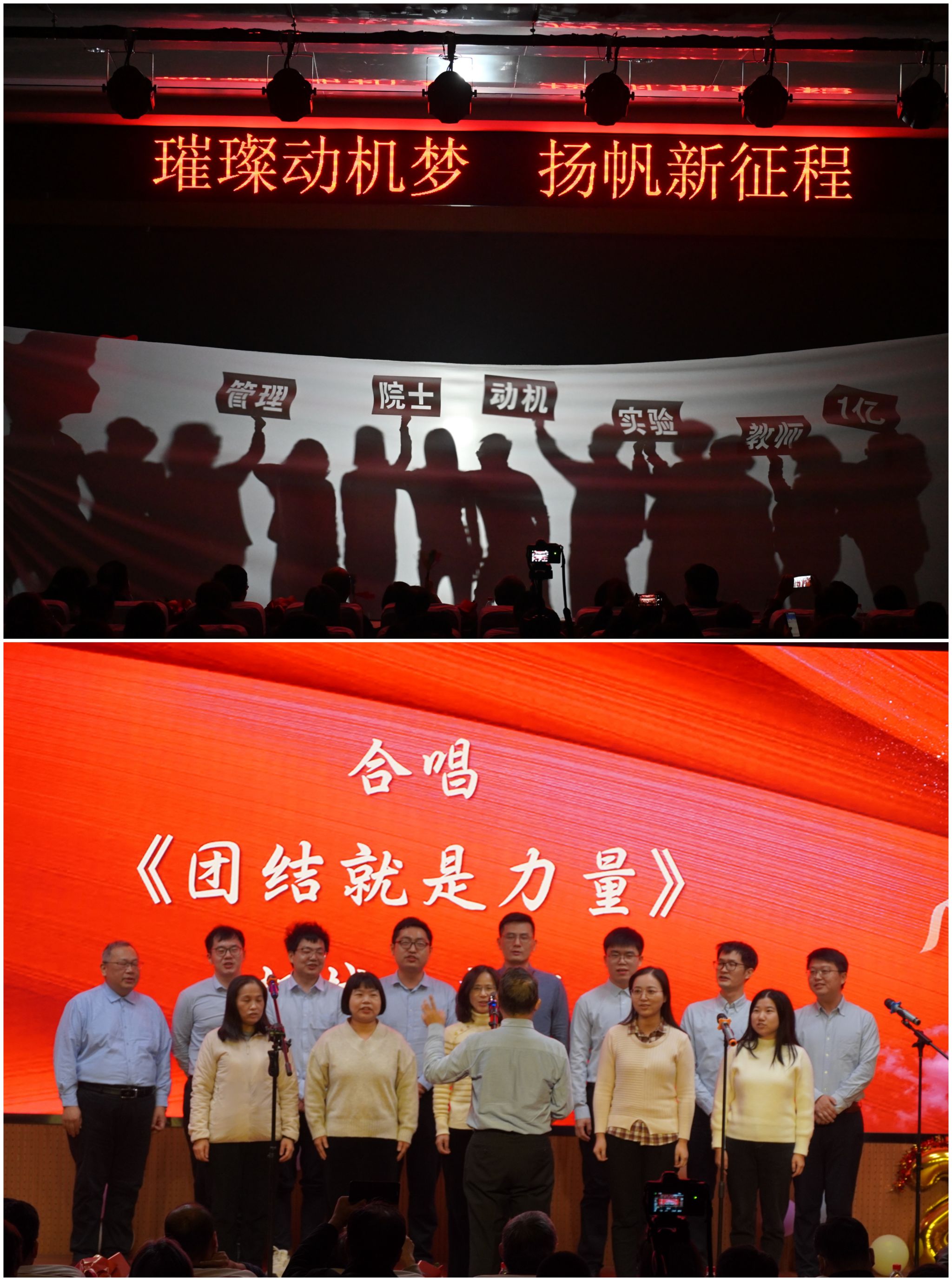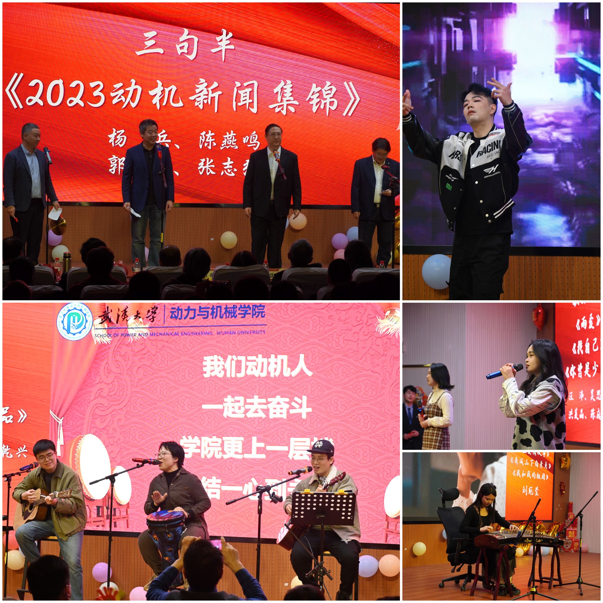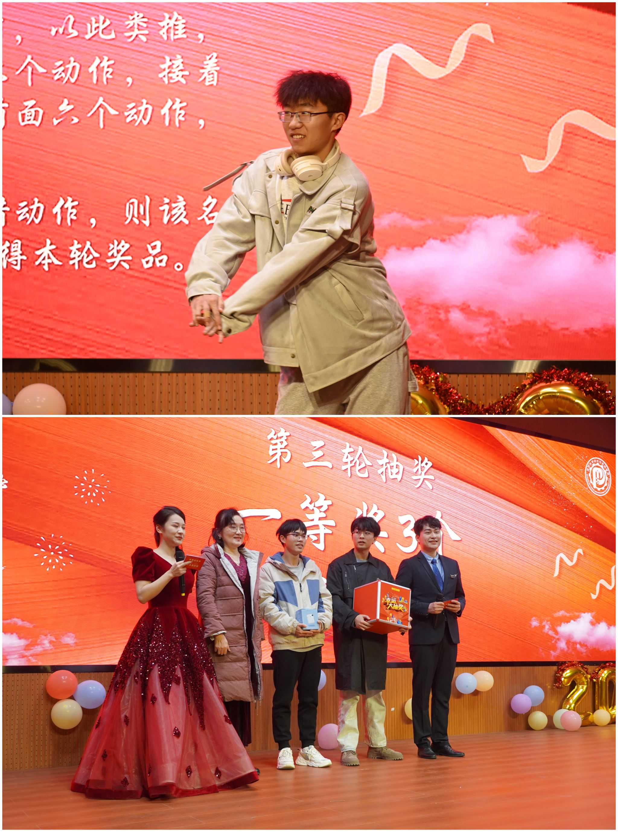 联欢会现场,学院师生给大家带来歌曲合唱《团结就是力量》、《水手》、《同一首歌》,影子舞《快乐园丁》、乐器串烧《时空漫游的旋律之旅》、古筝串烧演奏、吉他弹唱《最伟大的作品》、舞蹈《DUN DUN》、三句半《2023动机新闻集锦》、歌曲串烧《你曾是少年》等丰富多彩的节目表演,呈现了一场精美绝伦的视听盛宴。除了精彩的节目,联欢会还设置了趣味的活动环节和刺激的抽奖环节,互动游戏《舞蹈动作接力》让整个会场欢笑不断,小游戏《赛马》让每一位观众都参与其中,丰富的奖品让所有师生都沉浸在这份欢乐和惊喜之中。