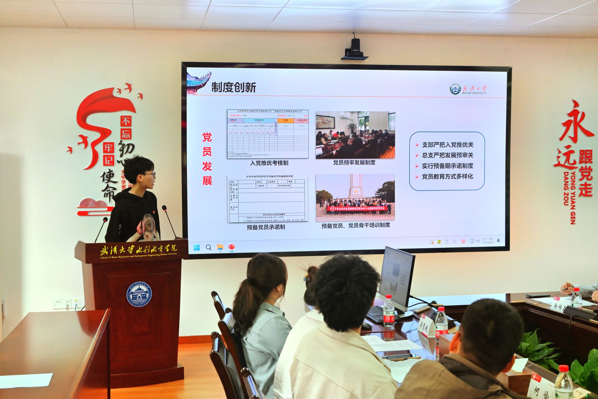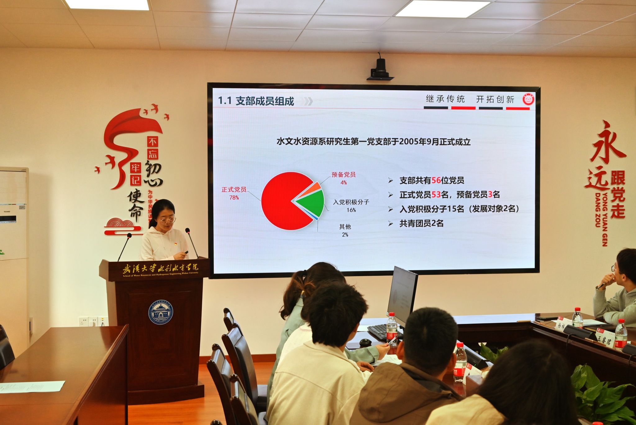 接着,水利水电学院研究生党总支学生副书记童政从全方位组织建设、全过程制度创新、多元化特色活动三个方面介绍了研究生党建工作情况。水文资源系研究生第一党支部书记王新惠讲述了老中青三代党支部联合活动、党建宣传平台建设等特色举措。水文工程系研究生第四党支部书记王睿珺从执行力、活动力、文化力三方面介绍了支部的特色党建工作。该支部依托“果树成长”党员培养模式,充分发挥学生党支部的战斗堡垒作用和研究生党员的先锋模范作用,影响和带动支部成员坚定信念、团结进步、健康成长。