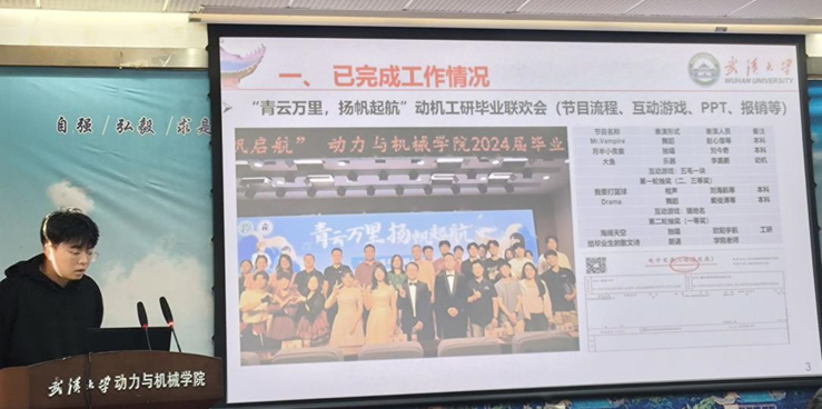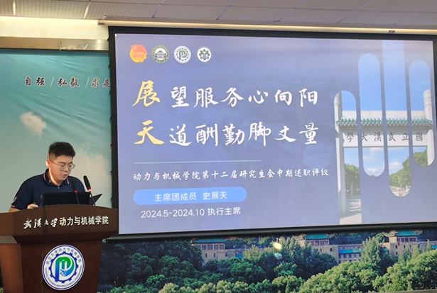 院研究生会主席团成员王乐展示了自己的工作成果,并对开展的活动进行总结反思。他希望接下来能够带领全体成员,围绕学校人才培养的目标,着力提高研究生会骨干的工作能力,积极打造学院品牌活动,提升研究生会的影响力。