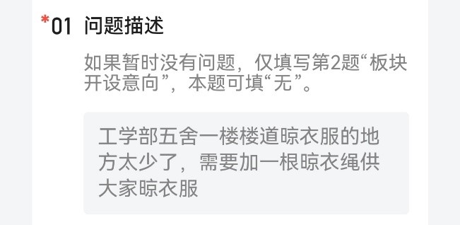 1. 关于宿舍设施:有同学反映宿舍楼道晾晒衣服空间不足,建议增设晾衣绳供大家晾晒衣物。