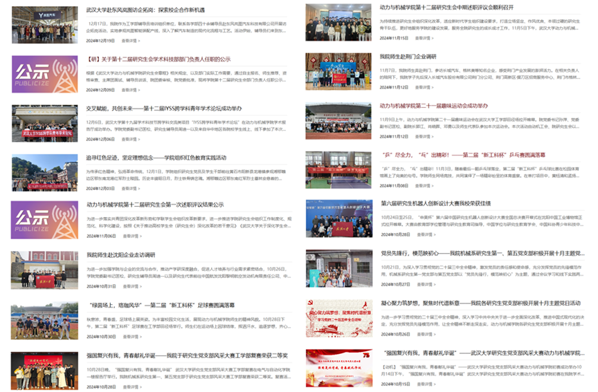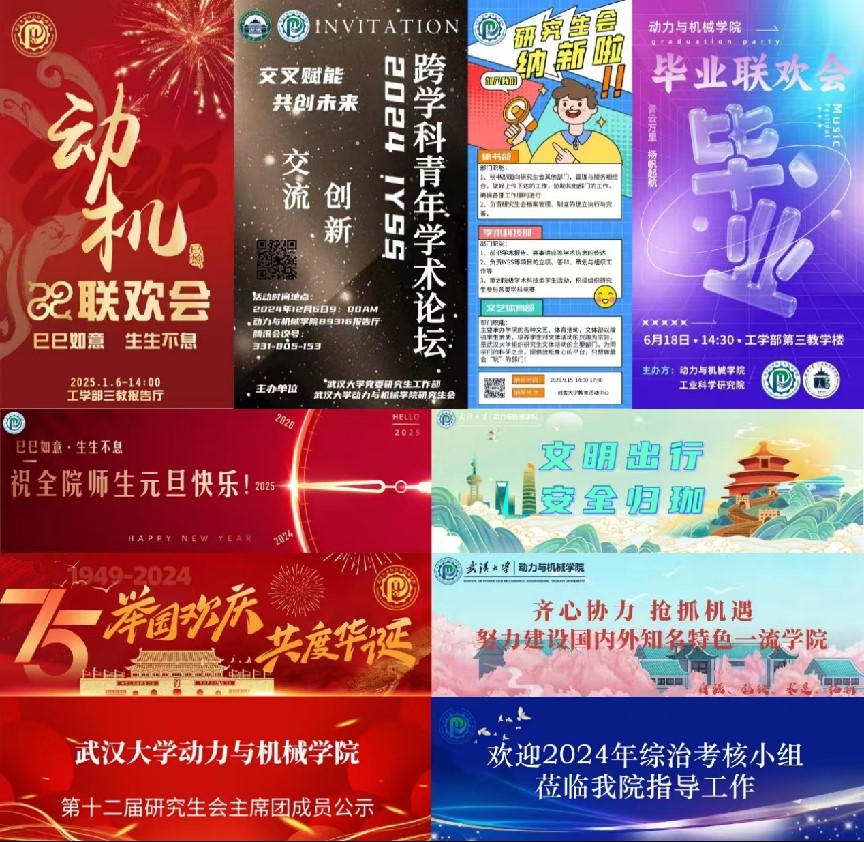 文艺活动: 组织同学参加研究生集体舞大赛 开展学院毕业联欢会和新年联欢会 举办“武大制噪”摇滚音乐节 五院合办“同频共振”草地音乐节 体育活动: 开展“新工科杯”体育文化节(包括羽毛球、乒乓球、篮球、足球和中式台球五个赛项) 举办学院师生趣味运动会 组织同学参加校研究生篮球赛 组织同学参加校研究生羽毛球赛 |
