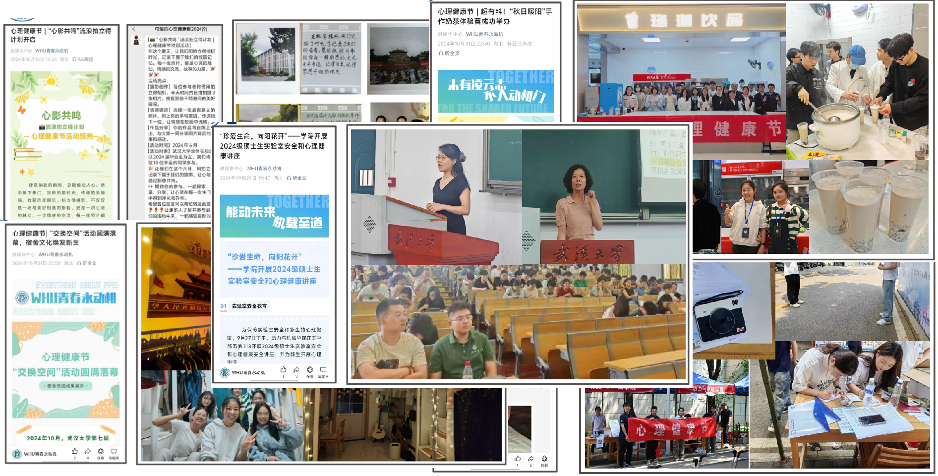 研究生心理健康节重点项目取得良好成绩 其中包括: “心影共鸣”流浪拍立得计划 “致敬时光”新生慢递活动 “交换空间”宿舍文化资助项目 “秋日暖阳”手作奶茶体验营 开展研究生心理健康讲座2次 与本科一同开展双周观影活动 开展“狼人杀”友谊赛 投稿校研究生会“研心说”栏目 与其他学院共同开展联谊活动 |