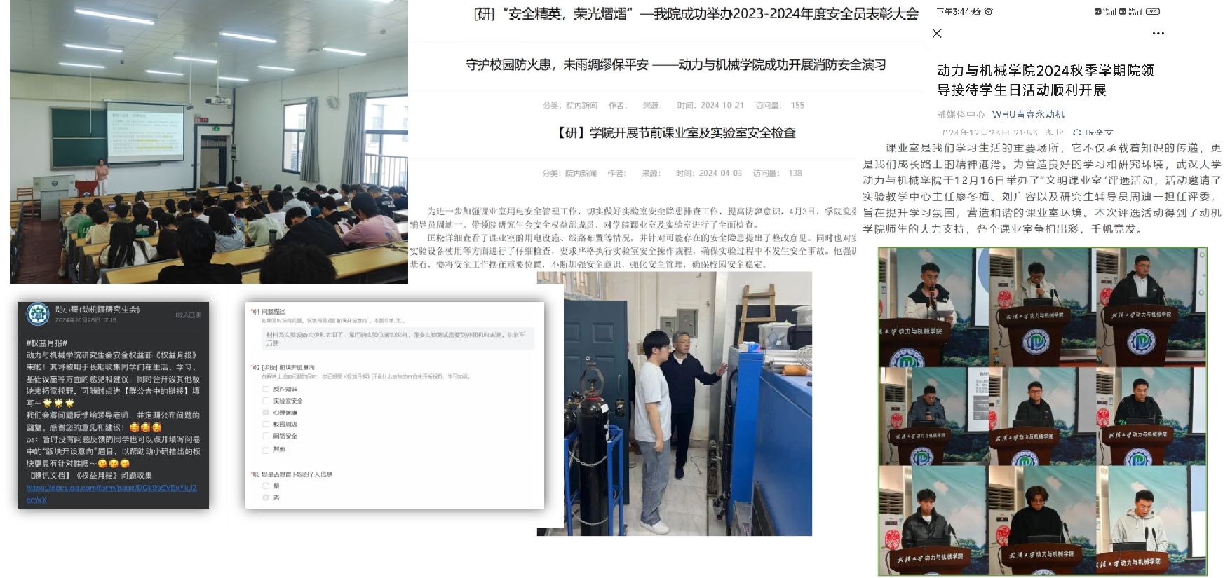 建立“权益月报”平台 开展院领导接待日活动 走访研究生课业室7次 开展实验室安全和心理健康讲座2次 开展“文明课业室”评选活动 组织消防安全演习 发布校园生活攻略 |