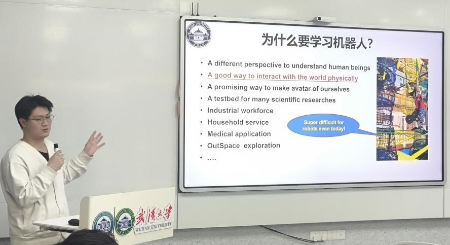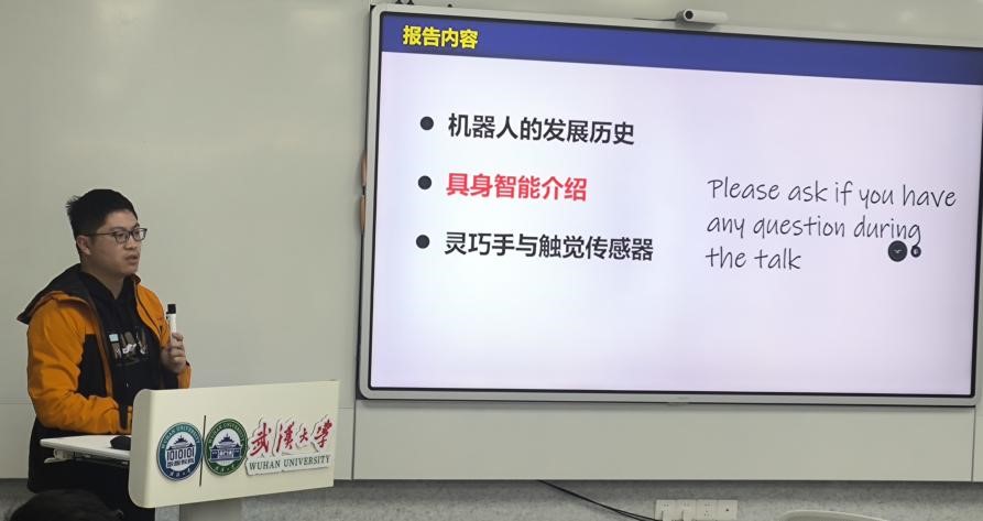 李梦德、费宣烨两位博士详细介绍了“天问”机器人的研发进展与技术难点。李梦德从机器人技术的发展历程入手,阐述了“天问”机器人在人工智能算法、精密机械设计及多传感器融合技术方面的创新突破。费宣烨进一步介绍了机器人在动态环境中的决策与行动能力,特别是在非结构化场景中的优异表现。两位博士的讲解深入浅出,为同学们揭开了科研工作的神秘面纱。