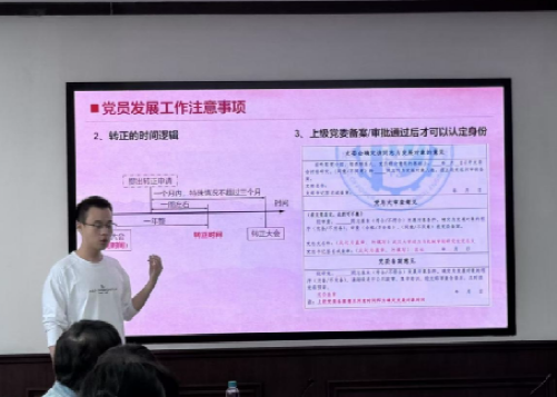 在入党流程培训环节,研究生党总支原学生副书记李沛龙讲解了党员发展的时间节点、关键环节、注意事项及档案管理等内容,并结合实际案例剖析了党员发展工作中的重点与难点,为各支部规范开展党员发展工作提供了指导。